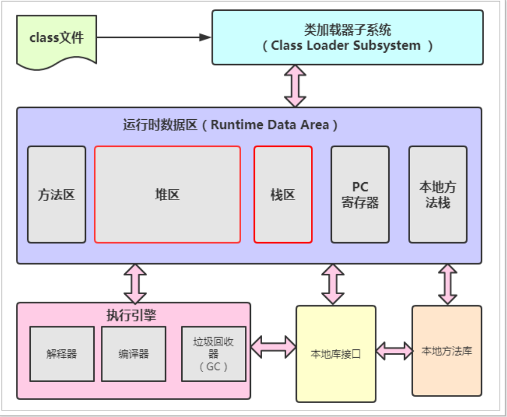 由上图可以看出,JVM主要由三大部分构成,即 类加载子系统 / 运行时数据区 / 执行引擎