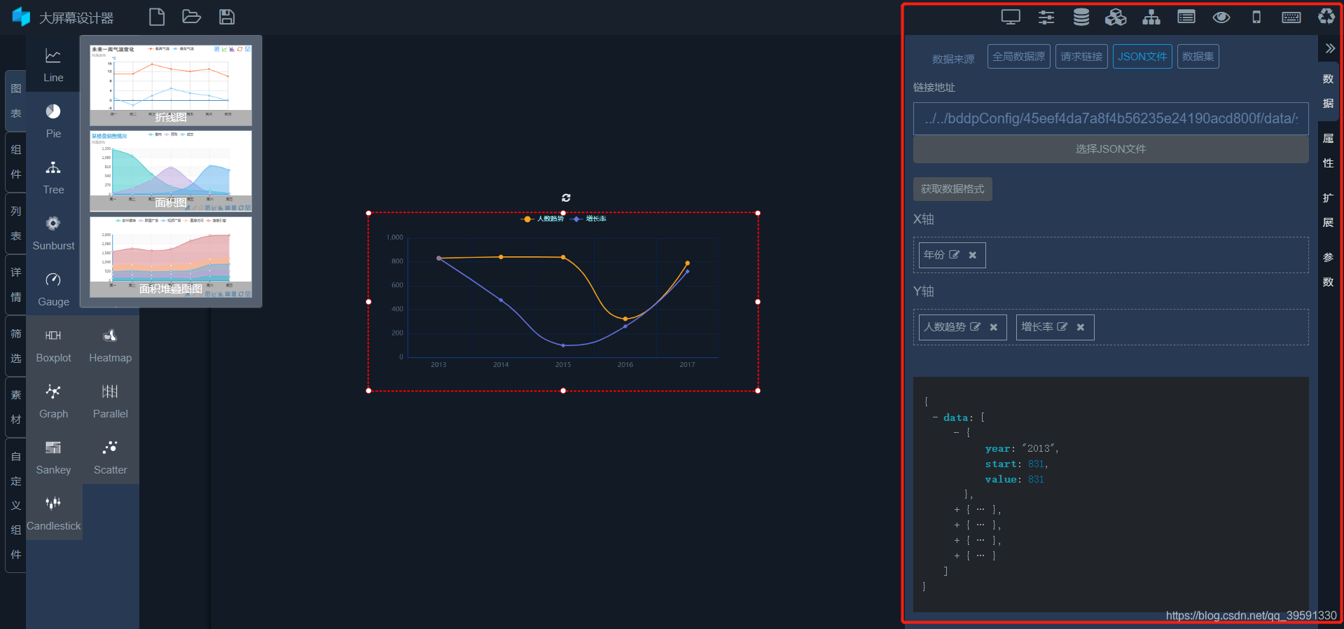2.通过JSON文件方式获取数据配置折线图,数据获取成功后,在属性里面调整折线图主题背景