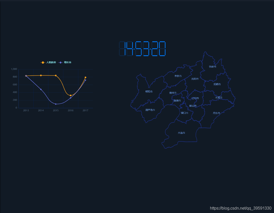 最终我使用了RDP报表中的大屏报表工具制作出的可视化大屏模板(主要是因为一、免费,二、好用)。
