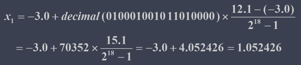 问题的可能解为实数对 的形式。这里首先将每个变量编码为二进制位串,然后将表示各个变量的二进制数串连接起来便得到问题可能解的一种表示。表示每个变量的二进制位串的长度取决于变量的定义域和所要求的精度。