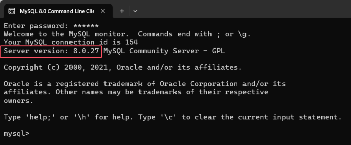 安装完成后启动MySQL提供的Command Line Client,输入root账号的密码后可进入服务器控制台,可以看见相关版本信息,即为安装成功。