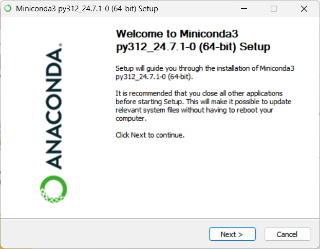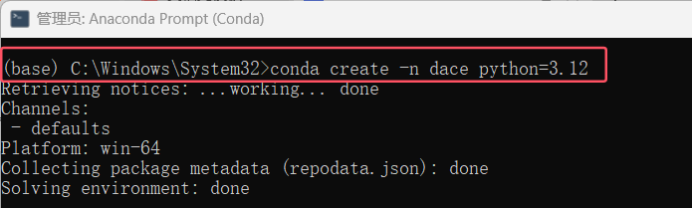 安装好miniConda,进入其提供的Anaconda Prompt控制台,输入conda create -n dace python=3.12新建一个虚拟环境dace,指定python版本为3.12。