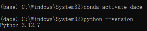 新建环境完成后,输入 conda activate dace 进入对应环境,然后输入 python --version 检查 python 版本,显示 3.12.7,至此 python 环境设置完成。