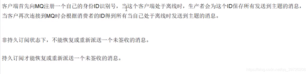 topic模式,先订阅一次,消费者启动一次后,即使关闭离线消费者生产者发送持久化消息,消费者再次连接可以收到之前的消息类似微信公众号。