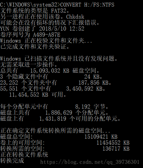 2、使用转换方式将u盘文件系统转换为可以传输大于4GB单个文件