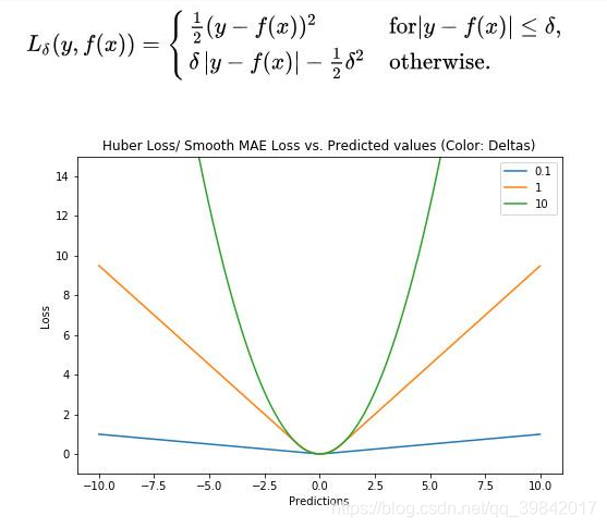 Huber损失函数,也称为平滑的平均绝对误差。Huber损失对数据中的异常点没有平方误差损失那么敏感,它在0处也可微分。本质上,Huber损失是绝对误差,只是在误差很小时,就变为平方误差。误差降到多小时变为二次误差由超参数δ(delta)来控制。当Huber损失在[0-δ,0+δ]之间时,等价为MSE,而在[-∞,δ]和[δ,+∞]时为MAE。