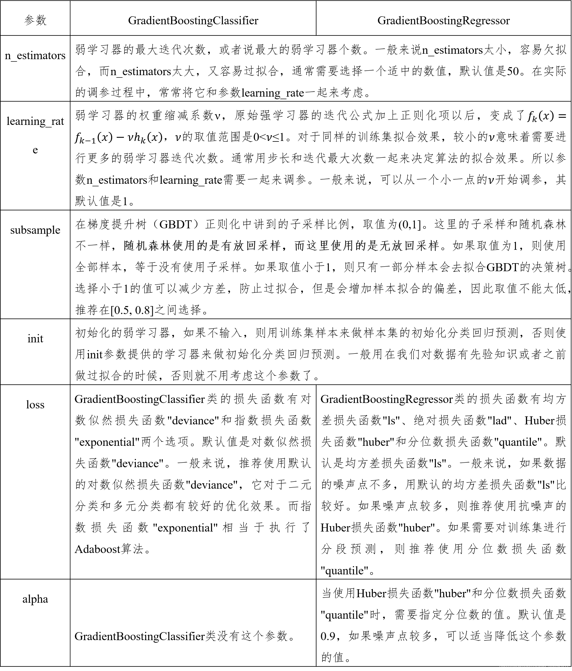 在scikit-learn中,GBDT类库包含GradientBoostingClassifier和GradientBoostingRegressor两个函数,其中,GradientBoostingClassifier用于GBDT分类,GradientBoostingRegressor用于GBDT回归。两者的参数完全相同,但是有些参数比如损失函数Loss的可选项并不相同,可以将参数分为两大类,第一类是Boosting框架的重要参数,第二类是弱学习器CART回归决策树的重要参数。下面,将从这两个方面进行介绍。