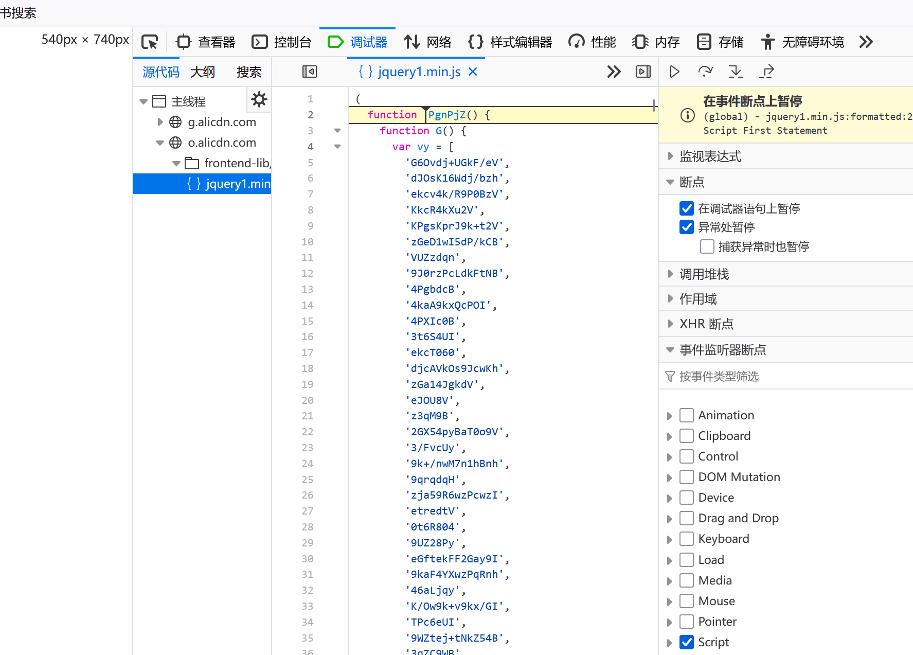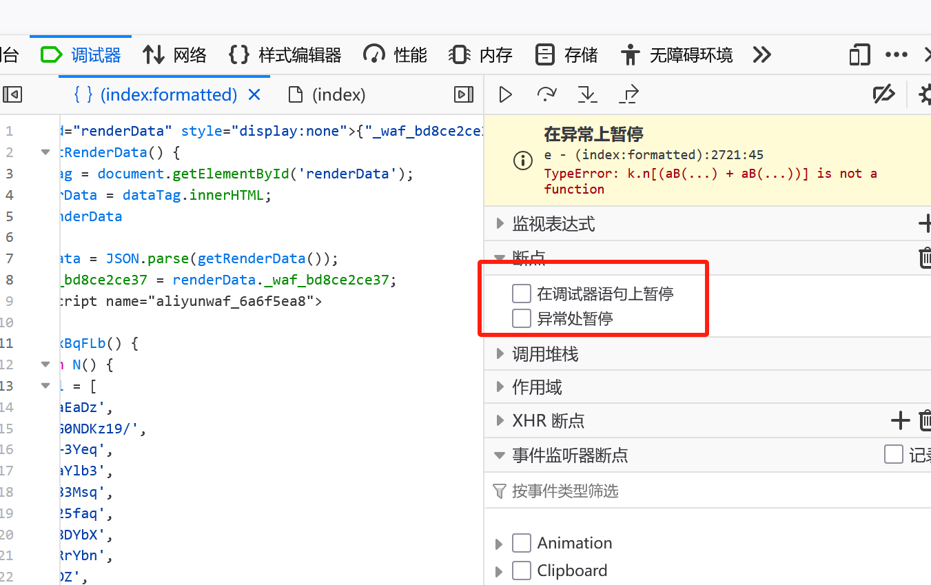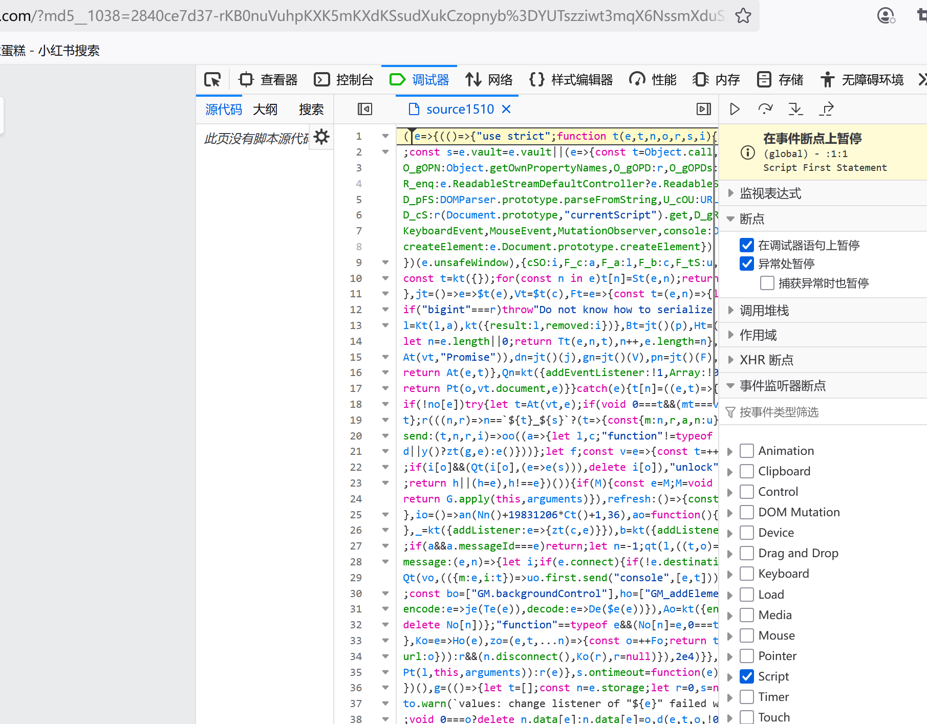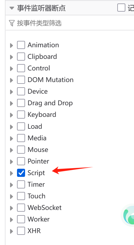 首先开启全局断点,F12——调试器——找到script勾选