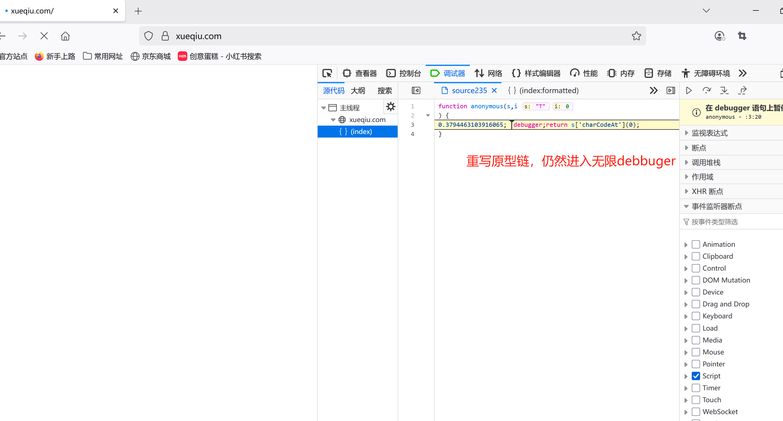 并且使用重写debbuger原型链的方式和重置debbuger函数的方法,全部都失效了,如下图所示,包括重写eval或者定时器的操作也没用。还是会进入无限debbuger。(目前不知道具体的原因是什么,但是可以推断里面一定做了检测,然后将debbuger强制还原了)