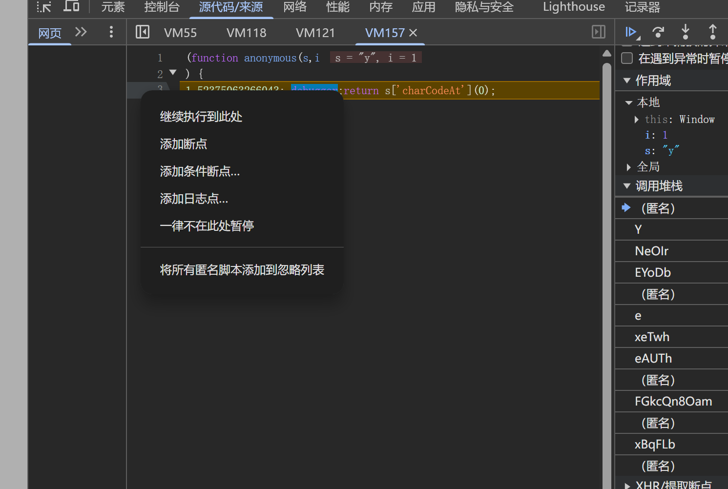 由于每运行一次就会进入一个新的vm文件debbuger,这也就导致我们没有办法通过never parse here取消debbuger。严重影响我们分析js的运行堆栈,也会导致我们下的cookie hook没办法调试。