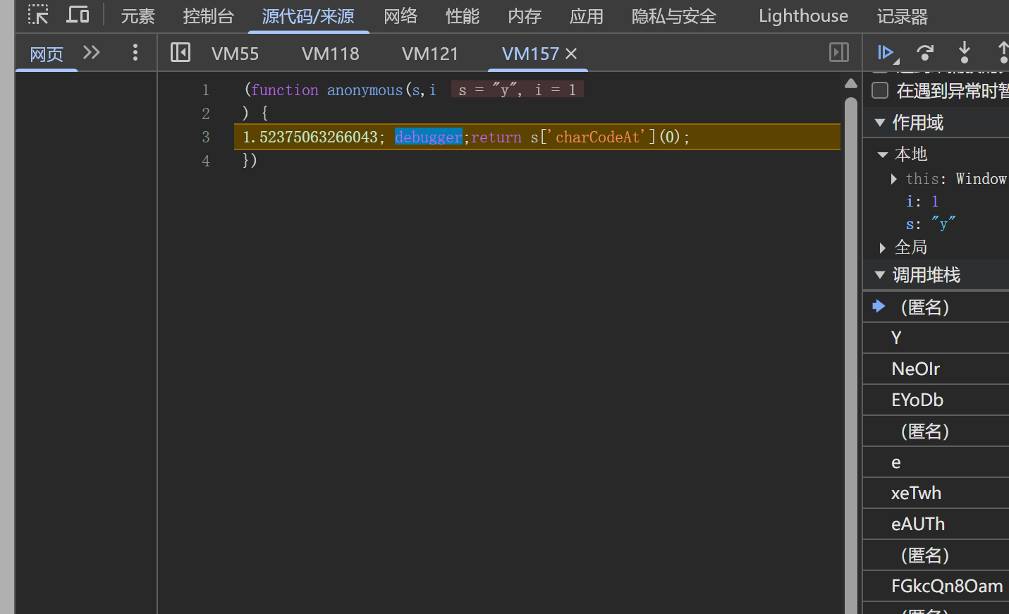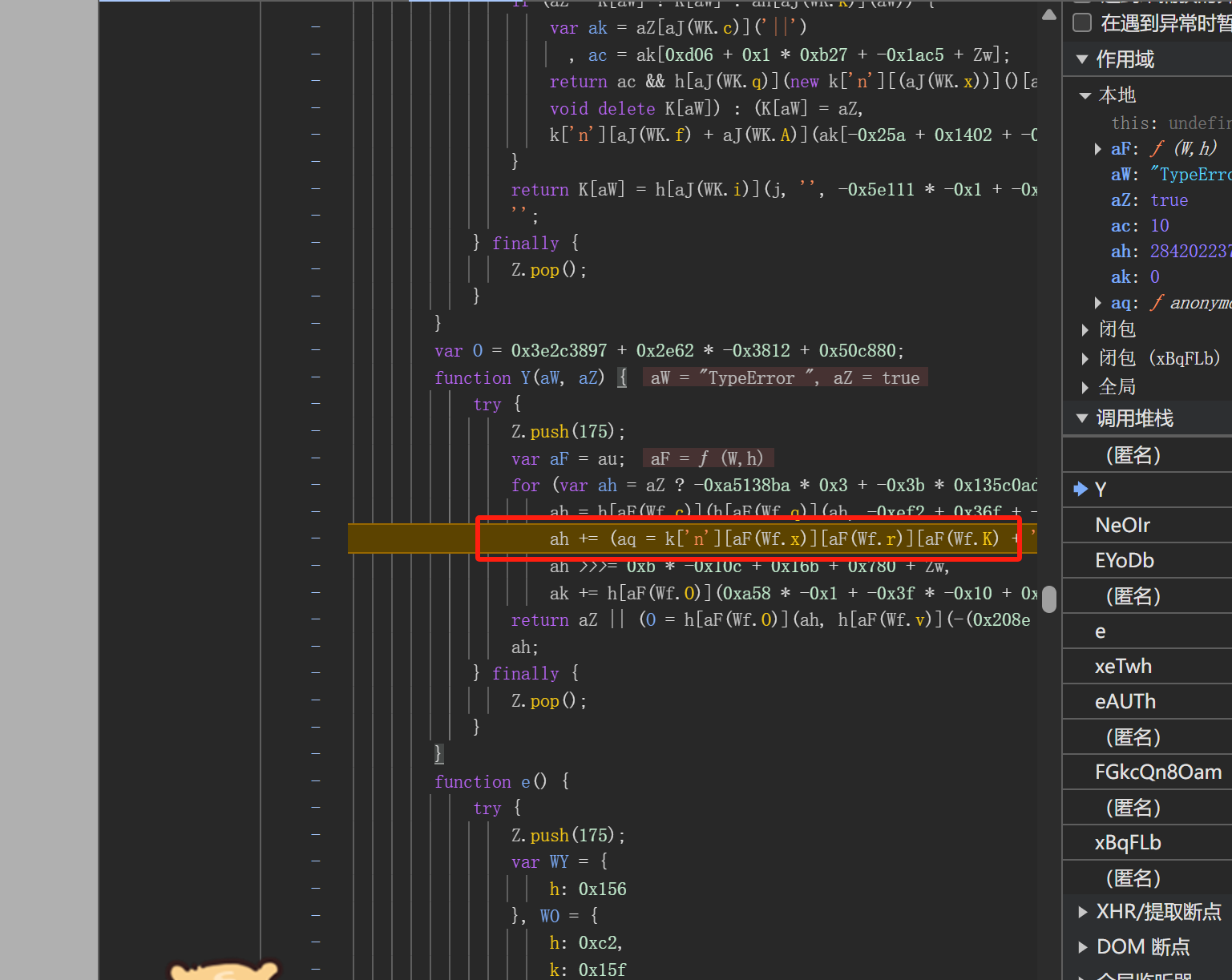 然后接着运行,可以发现进入了第二个script,也就是运行了大量混淆的js代码,然后接着会进入到一个for循环。大概长这样。当执行到里面的ah += (aq = k['n'][aF(Wf.x)][aF(Wf.r)][aF(Wf.K) + 'r']('s', 'i', h[aF(Wf.j)](h[aF(Wf.f)](h[aF(Wf.A)](G), ak), h[aF(Wf.i)])))(aW[ak], ak),这一句时,就会进入无限debbuger。