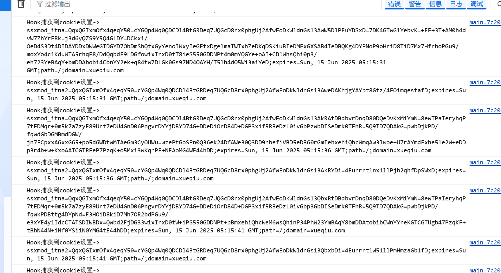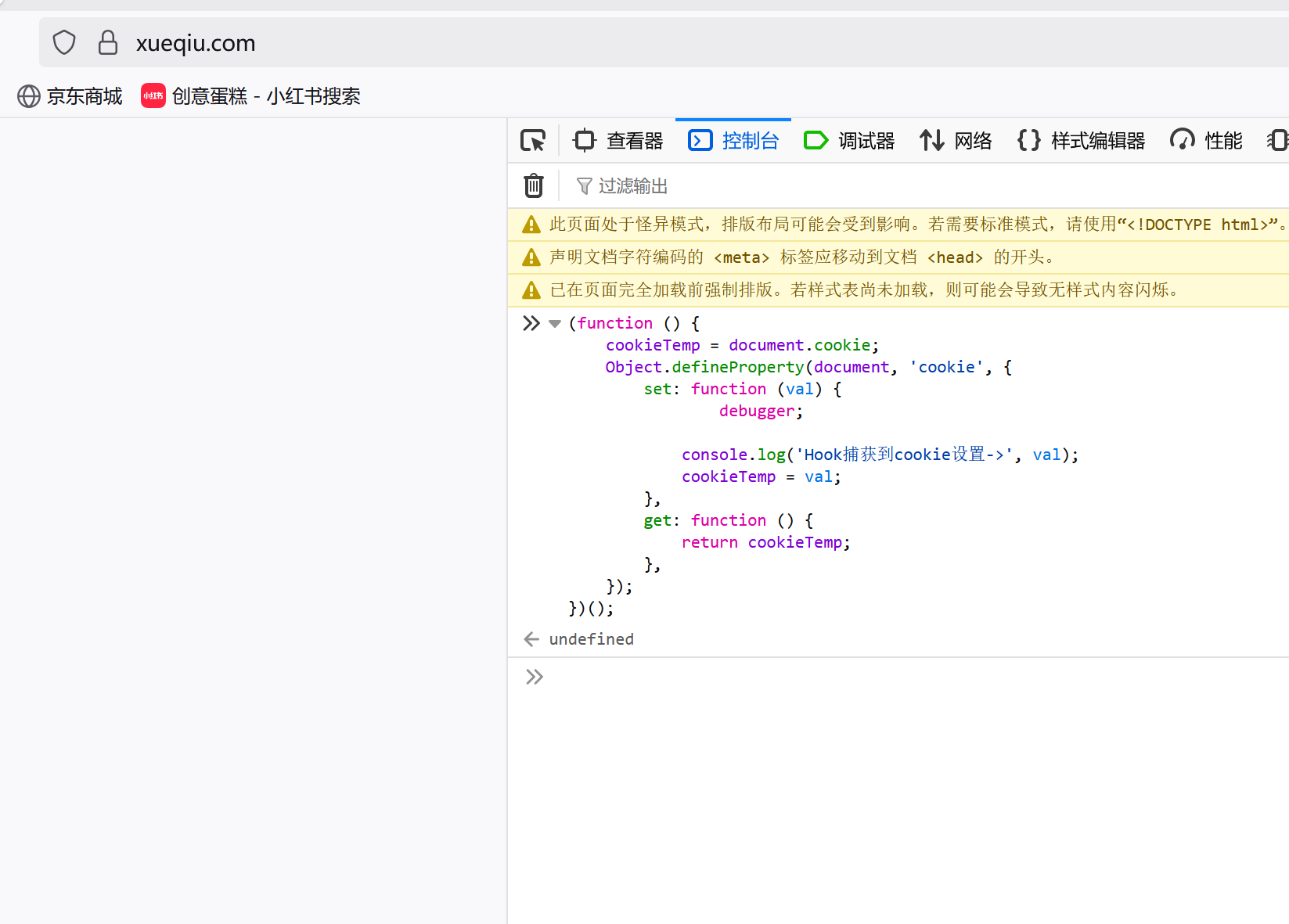 我们尝试写一段脚本注入,hook一下cookie的生成,可以看到正常hook到了。