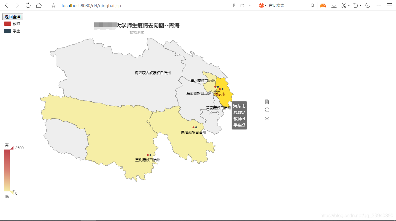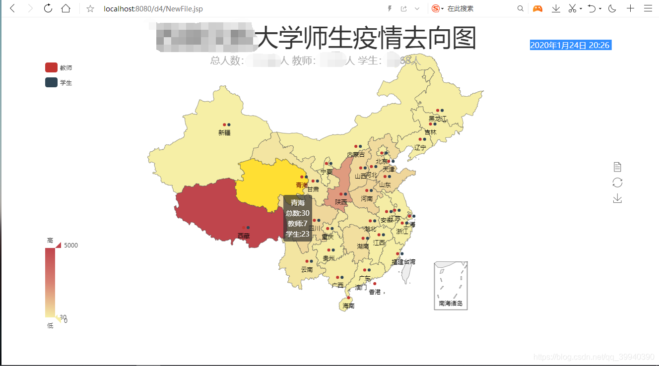 1.今天给大家带来的是Echarts的中国地图可视化(数据从后台获取),这是很多Echarts教程没有提到的知识,因自己去过北京参加了一次高校教师培训会(本人是学生),用的是Echarts获取Servlet类中的数据。刚好本次假期又有学校老师让做疫情地图,所以便结合所学,对学校提供数据(sql数据),用Echarts的map系列做了一个疫情地图。