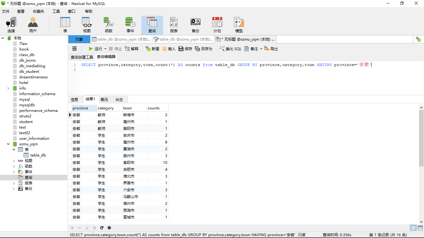 String Sql = "SELECT province,category,town,count(*) AS counts from table_db GROUP BY province,category,town HAVING province='安徽' ";