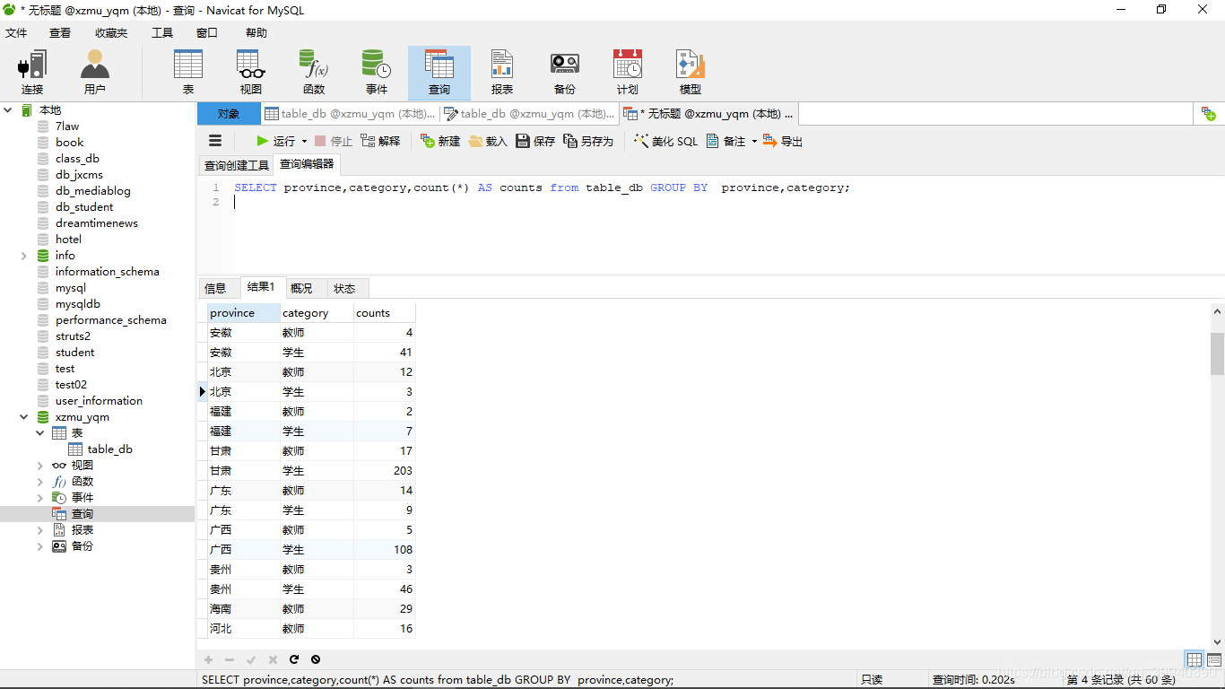 String Sql = "SELECT province,category,count(*) AS counts from table_db GROUP BY province,category"; //数据库查询语句,根据需要自己替换