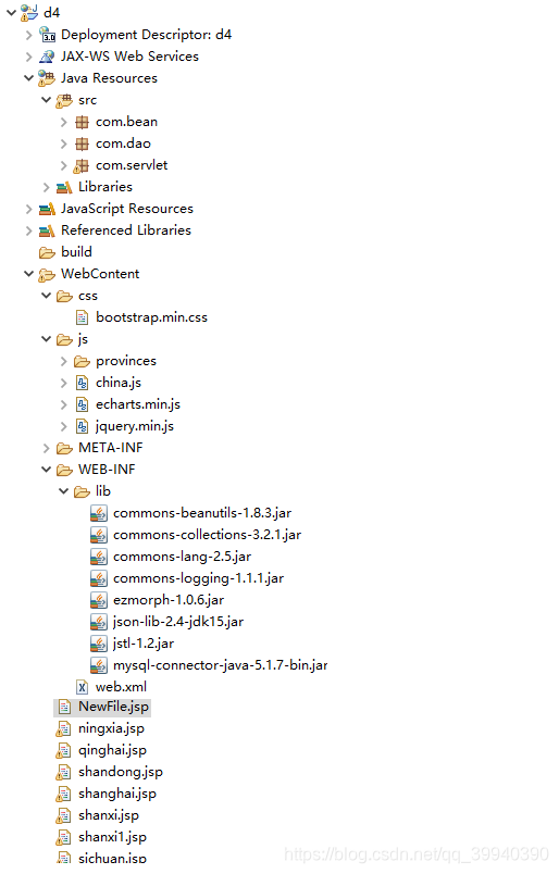 1.项目结构(js文件下的provinces文件夹放的是各个省的js文件,NewFile.jsp为中国地图)
