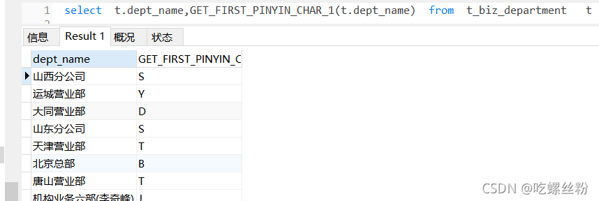 SELECT ELT(tmp_loc,'A','B','C','D','E','F','G','H','J','K','L','M','N','O','P','Q','R','S','T','W','X','Y','Z') INTO tmp_char; #获得汉字拼音首字符