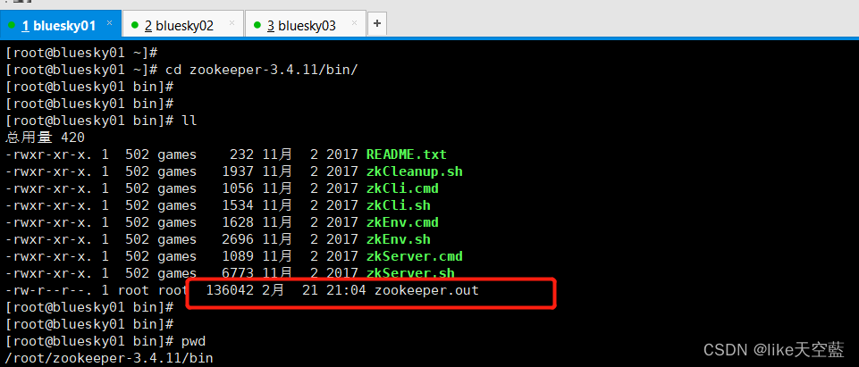 备注:如果启动过程中失败, 可在bin目录下查看 zookeeper.out 日志文件