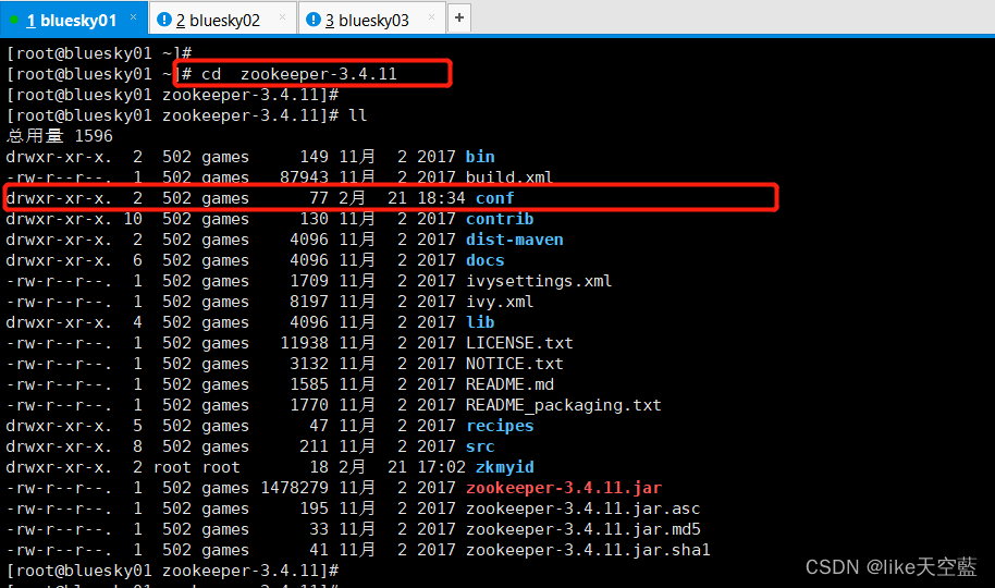 2.1 执行命令更改文件夹名称 (因为zoo_sample.cfg为示例配置文件,需要更改为正式配置文件zoo.cfg) 更改命令:mv zoo_sample.cfg zoo.cfg
