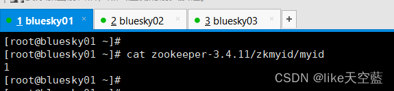 在zkmyid目录下创建myid文件,文件内容为“1” 需保证每台主机的唯一性 范围是 (1-255)