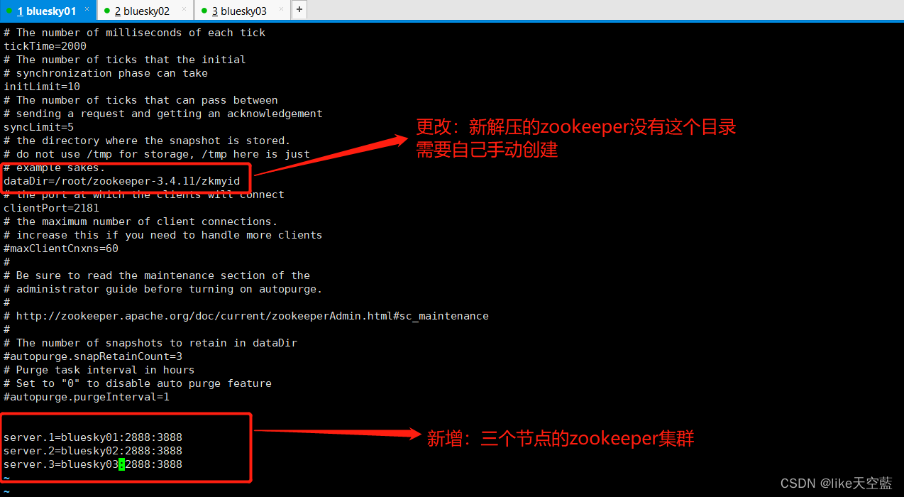 2.2 修改配置文件:vi zoo.cfg (按图片来,其他可以保持不变)