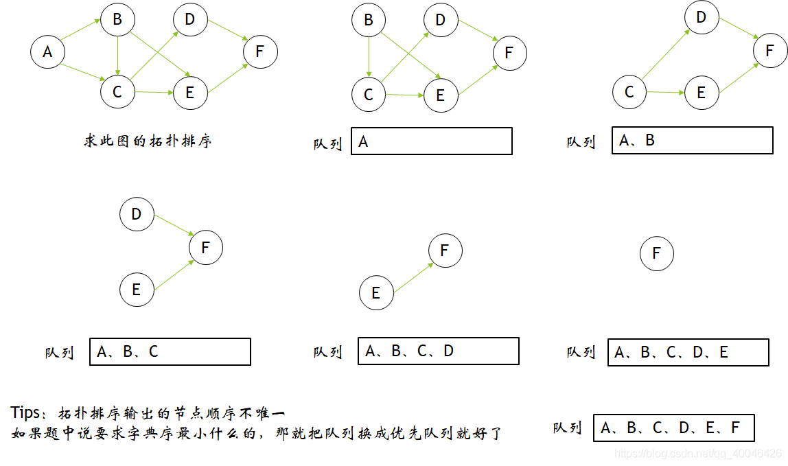 (3)重复 1 和 2 直到当前的 DAG 图为空或当前图中不存在无前驱的顶点为止。后一种情况说明有向图中必然存在环。