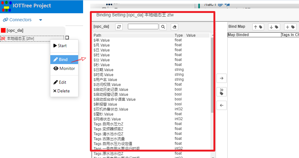 成功建立之后,我们鼠标右键新增加的“本地组态王”接入。选择Bind菜单项,打开一个弹出窗口。如果上面的参数正确,并且连接正常,弹出窗口就会列出组态王当前运行的项目能够提供的所有数据项,这个也给个图吧。如果没有出现数据项,那只能回到前面环境配置和权限设置调整了。