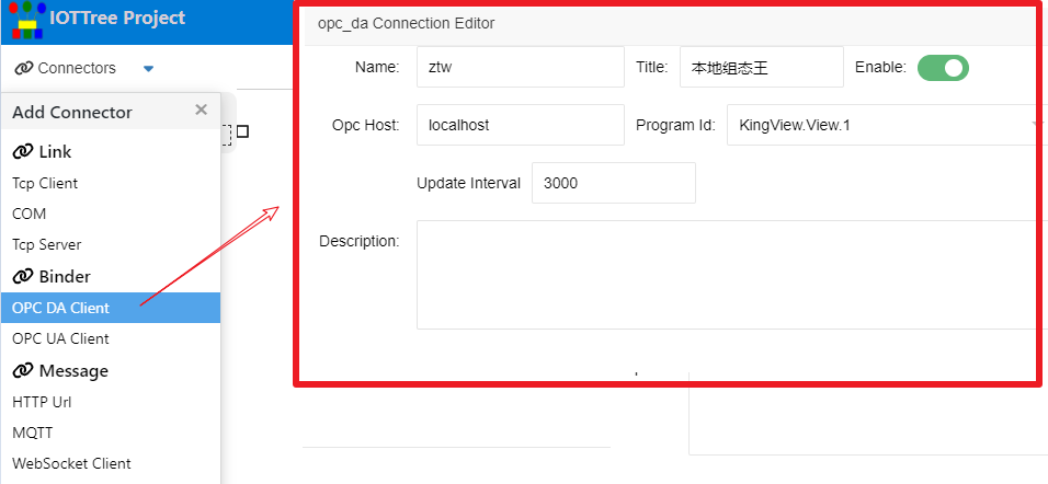在左边Connectors下拉菜单选择OPC DA Client,弹出窗口填写内容如上图,其中,Program Id选择KingView.View.1。这个其实就是对应与组态王的Opc程序id。如果没有这个选项,说明没有找到组态王的Opc接口。