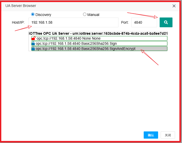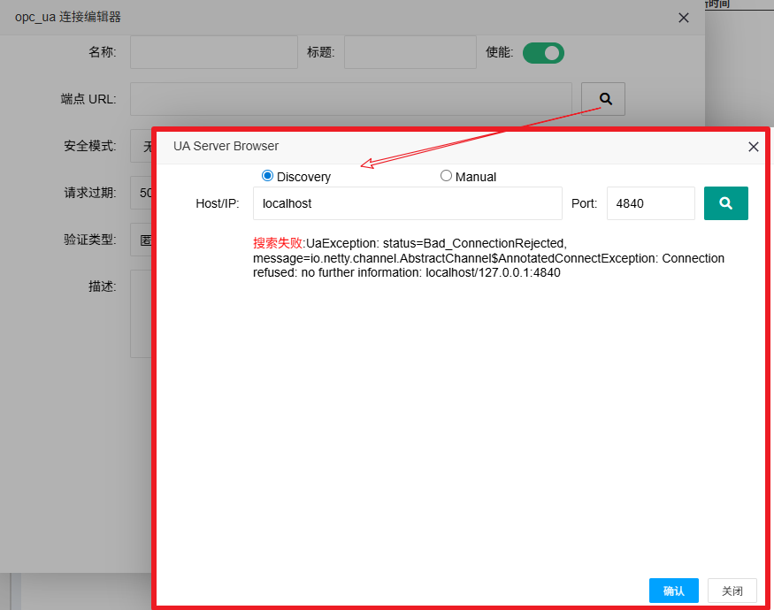 OPC UA协议支持发现功能,只需要知道运行节点的IP地址和端口,就可以直接查找这个运行节点支持的OPC UA连接端点。点击端点URL的查询按钮,弹出"UA Server Browser"对话框,可以看到此时IOT-Tree会自动查找本地缺省端口4840的OPC Server实例,如果没有OPC UA Server运行,这提示搜索失败,如下: