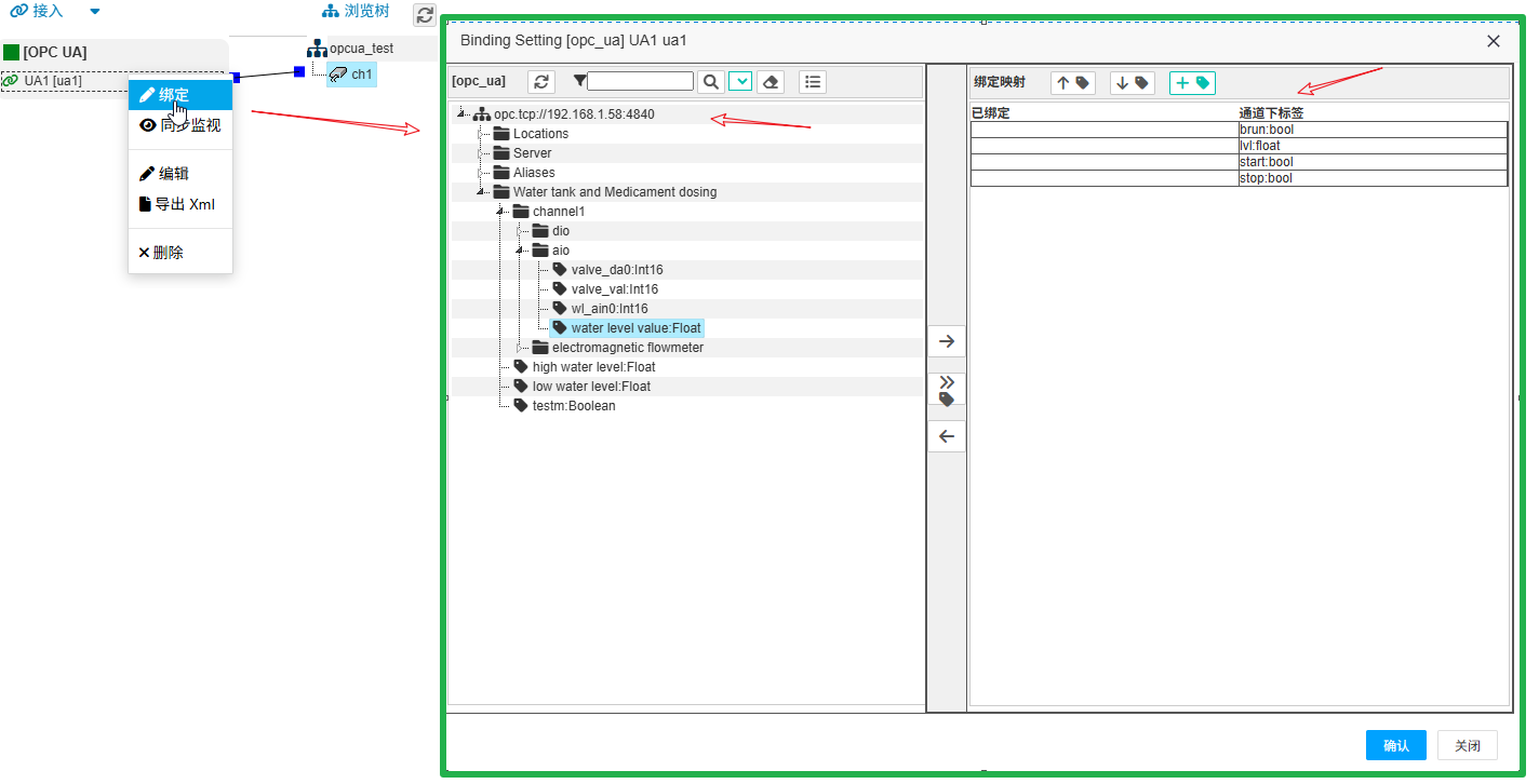 鼠标右键ua1,选择菜单项“绑定”,你可以在弹出对话框中看到左边的OPC节点树,右边的标签绑定列表: