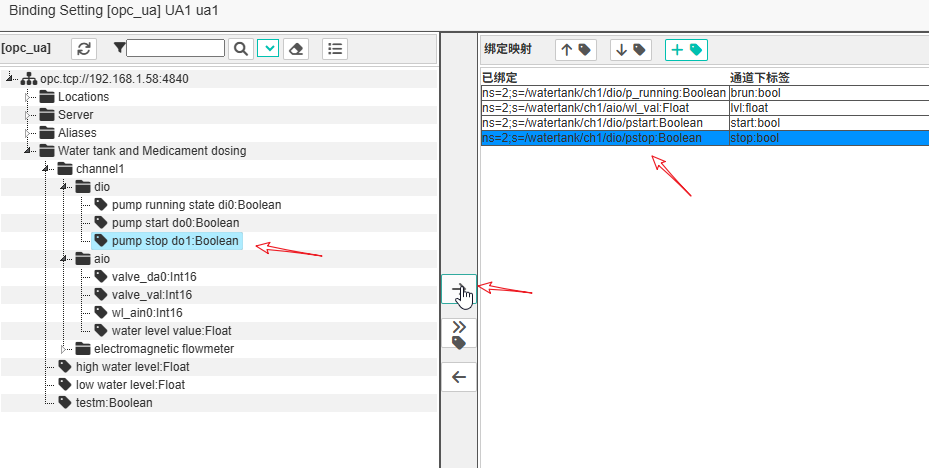 在左边选择的数据节点,然后在右边选择对应的通道下标签,点击中间右箭头绑定按钮,就可以完成一个OPC数据点到IOT-Tree通道下面特定标签Tag的绑定。多次操作可以绑定所有需要的内容,如下图: