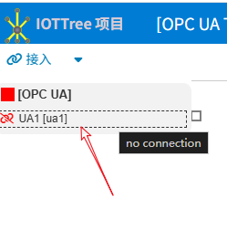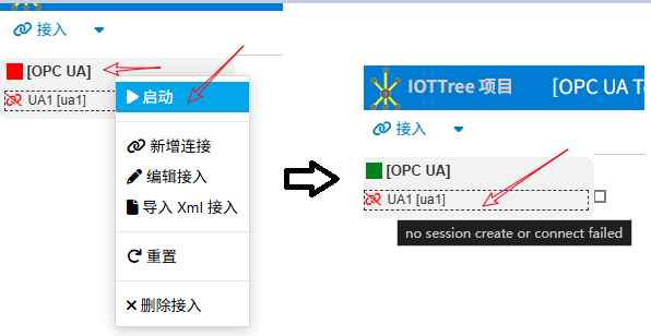 1,鼠标右键OPC UA分类,选择启动菜单项,等待一些时间之后,你会发现刚刚新配置的ua1接入无法连接成功,并且鼠标移到上方可以看到连接失败。如下图: