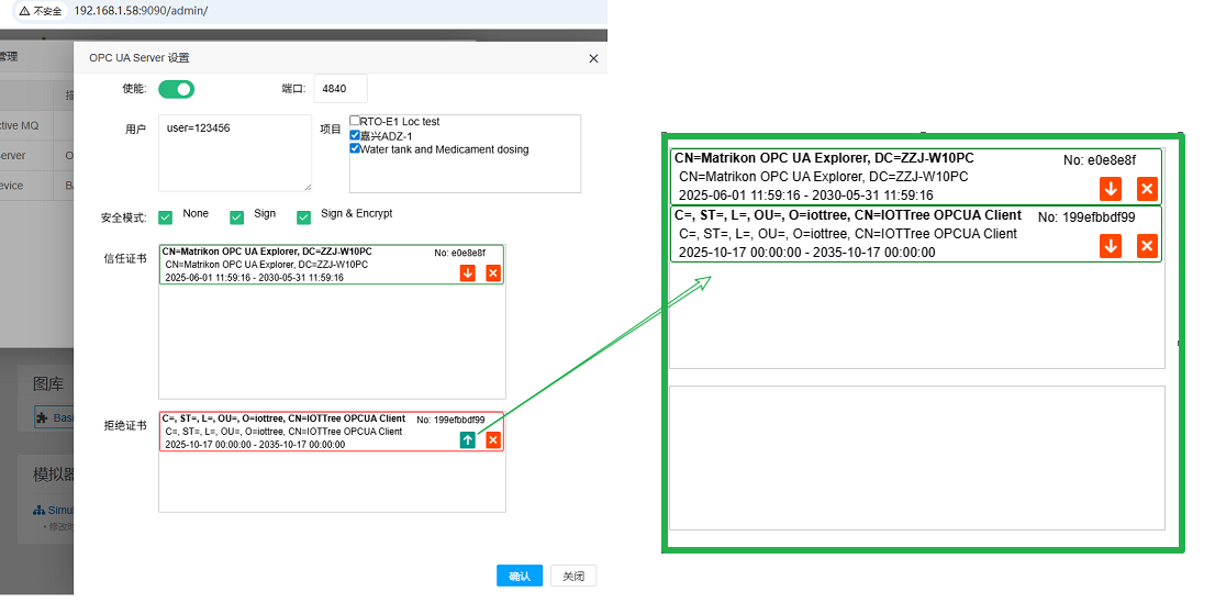 本文我们只需要访问边缘设备管理界面 http://192.168.1.58:9090/admin/。打开服务管理程序OPC UA Server服务,编辑界面可以看到新出现的拒绝证书,点击确认授信即可。