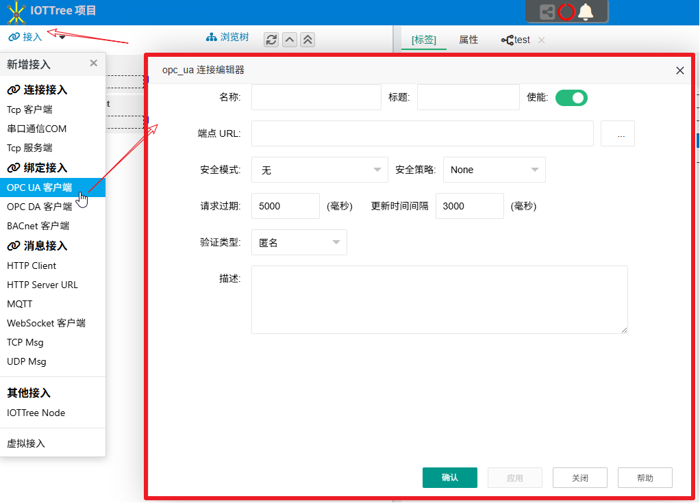 IOT-Tree Server直接提供一个OPC UA Client连接器,这个连接器支持使用绑定方式获取OPC UA Server的数据项到内部数据标签中。在IOT-Tree Server某个项目管理主界面中,点击左上角的“接入"菜单,选择“OPC UA Client”。你可以打开连接编辑对话框。如图: