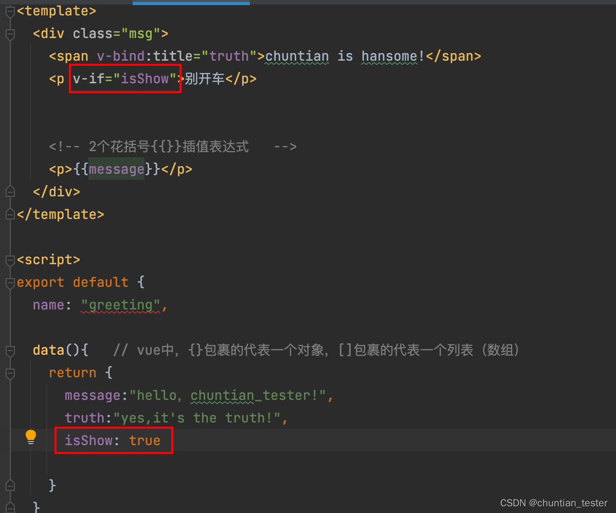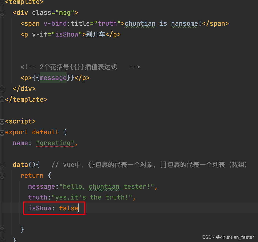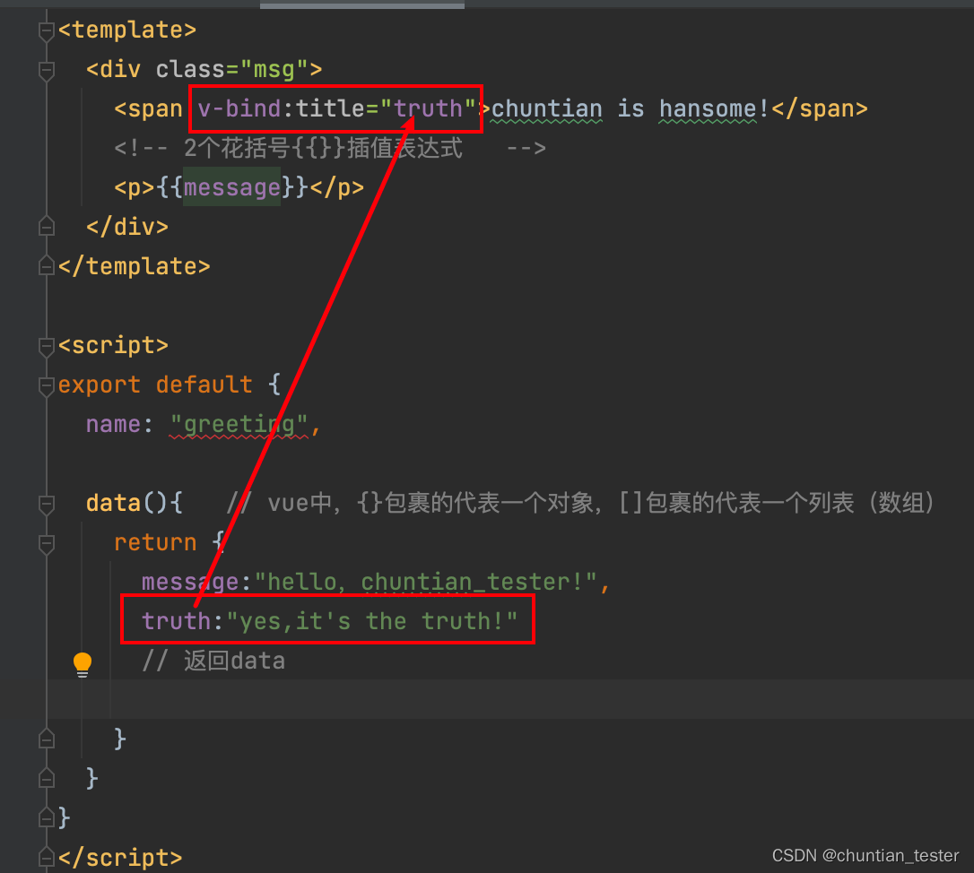 2.v-bind: 将数据绑定为属性值;{{truth}}将数据插入展示。可以缩写为: