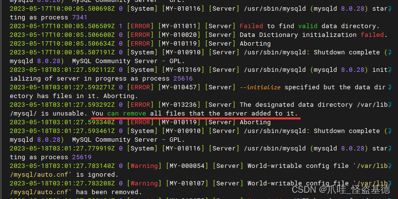 - 可能报错:[ERROR] [MY-010457] [Server] --initialize specified but the data directory has files in it. Aborting.