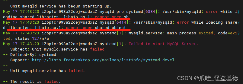 - 可能报错:mysqld[6414]: /usr/sbin/mysqld: error while loading shared libraries: libaio.so.1: cannot open shared object file: No such file or directory