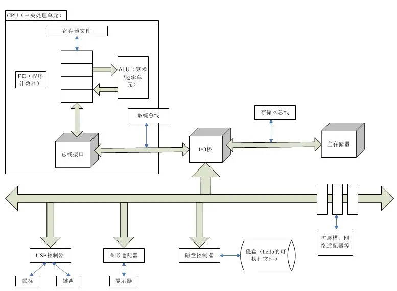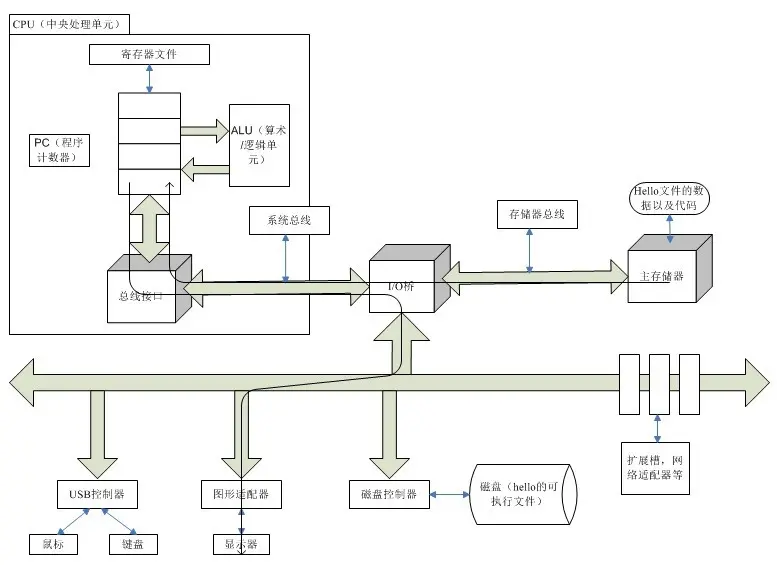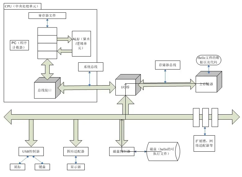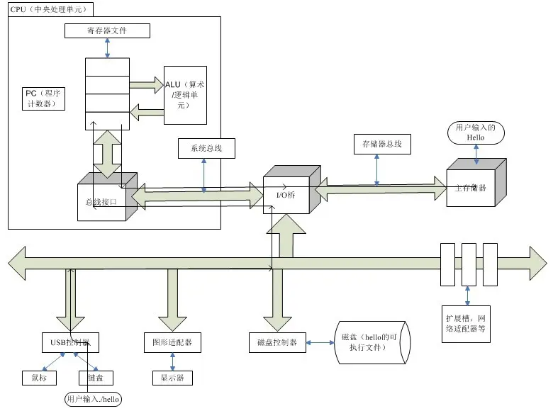 I/O设备:I/O设备是系统与外部联系的通道.I/O设备(键盘、鼠标、显示器等)由控制器(USB控制器)或者适配器(图形适配器)与I/O总线相连,两者的区别在于一个是主板上的芯片组,一个是主板插槽上的卡。