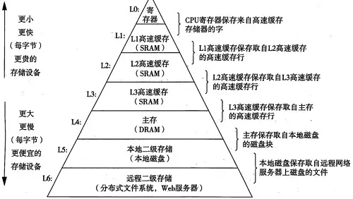 位于处理器芯片上的L1高速缓存速度和寄存器几乎一样,容量更大的L2告诉缓存则通过一条特殊总线连接到处理器,速度慢一些,但仍比主存快.它们采用静态随机访问存储器(SRAM)实现,有些系统甚至有L3告诉缓存.