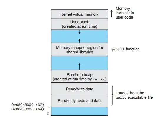 这里的地址自下向上依次增大,可以看出,图中标注了起始地址,分别为0x08048000(32位)以及0x00400000(64位),然后向上分别是只读代码和数据、读写数据、运行时堆、共享库的内存映射区间、用户栈以及内核虚拟内存区域.