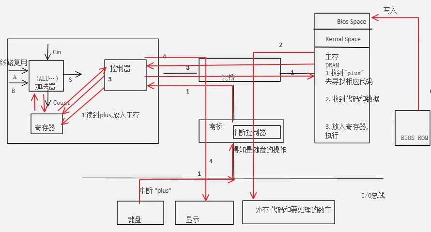 中断:我们想要通过键盘输入,那么系统怎么知道我们敲的是键盘呢?难道每时每刻保持监视键盘么?其实是我们敲键盘时候会给出一个中断,信号到南桥后,内部会集成一个可编程中断控制器,得知做出行为的是键盘.然后再到北桥,控制器等等...