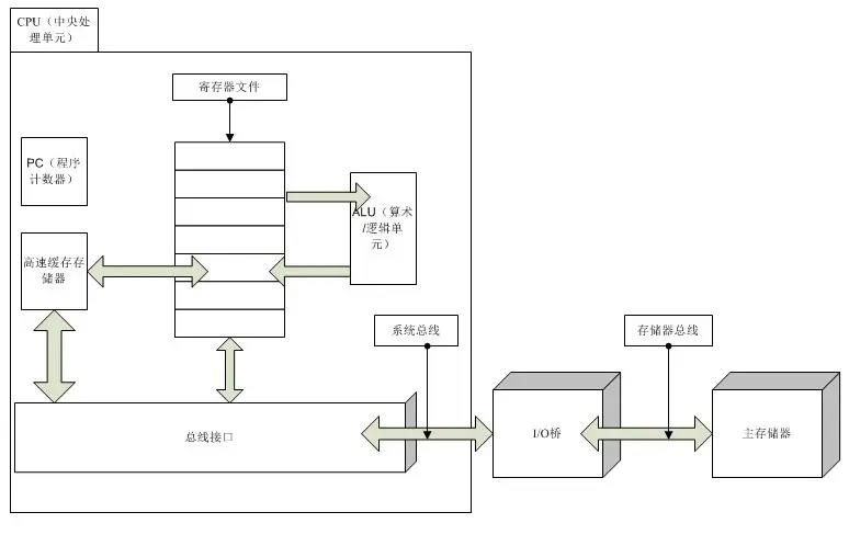 处理器:中央处理单元,是解释存储在主存中指令的引擎.处理器的核心是一个程序计数器(PC),它在整个计算机运行的期间都会指向一个主存中的一个内存地址,而地址当中则是一个计算机指令。处理器所做的,就是不停的执行程序计数器所指向的每一条指令。处理器所做的操作是围绕主存、寄存器文件以及算术/逻辑单元(ALU)进行的,这里面处理器做的最多的动作就是加载(从主存将数据复制到寄存器)、存储(从寄存器将数据复制到主存)、操作(将两个寄存器的内容复制到算术/逻辑单元进行操作,结果会再次复制到寄存器)以及跳转(改变程序计数器当中的内容)。