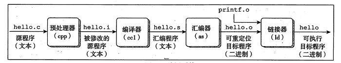 一个简单的C语言程序来说,一般要经过预处理器、编译器、汇编器和链接器的处理,才能被翻译成一段可执行的二进制文件。例如一段c语言helloworld程序.
