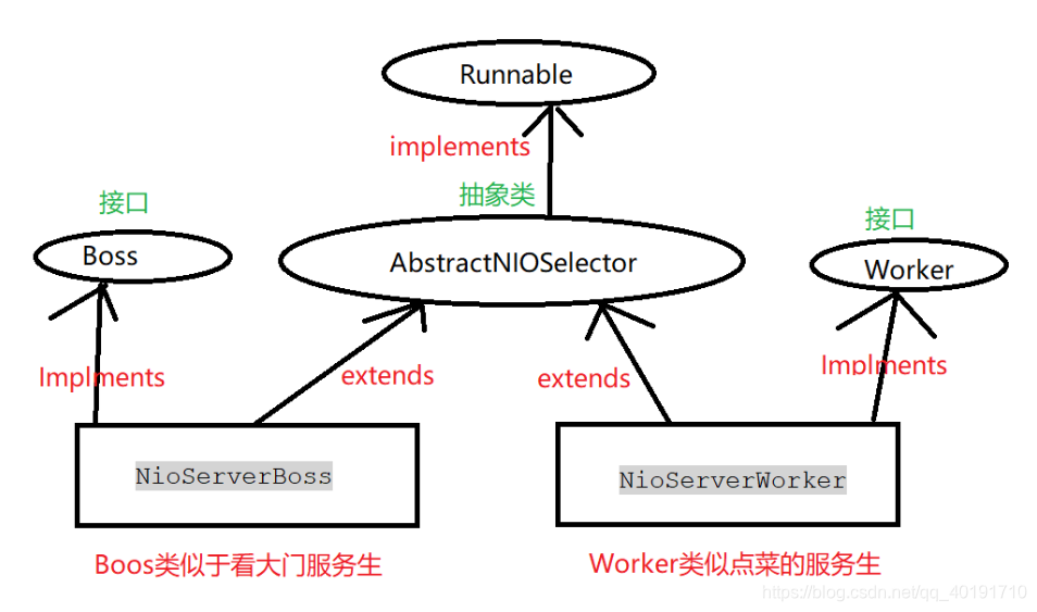 Boss(看门服务员接口)用来监听端口 Worker(点菜服务员接口) 实际的读写处理类
