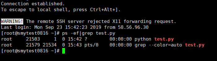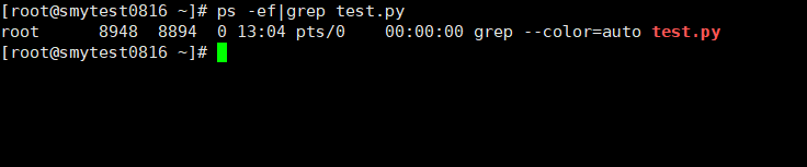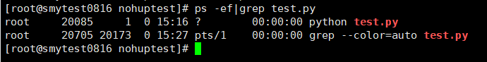 执行ps -ef|grep test.py查询一下,程序进程确实存在,如下图所示: