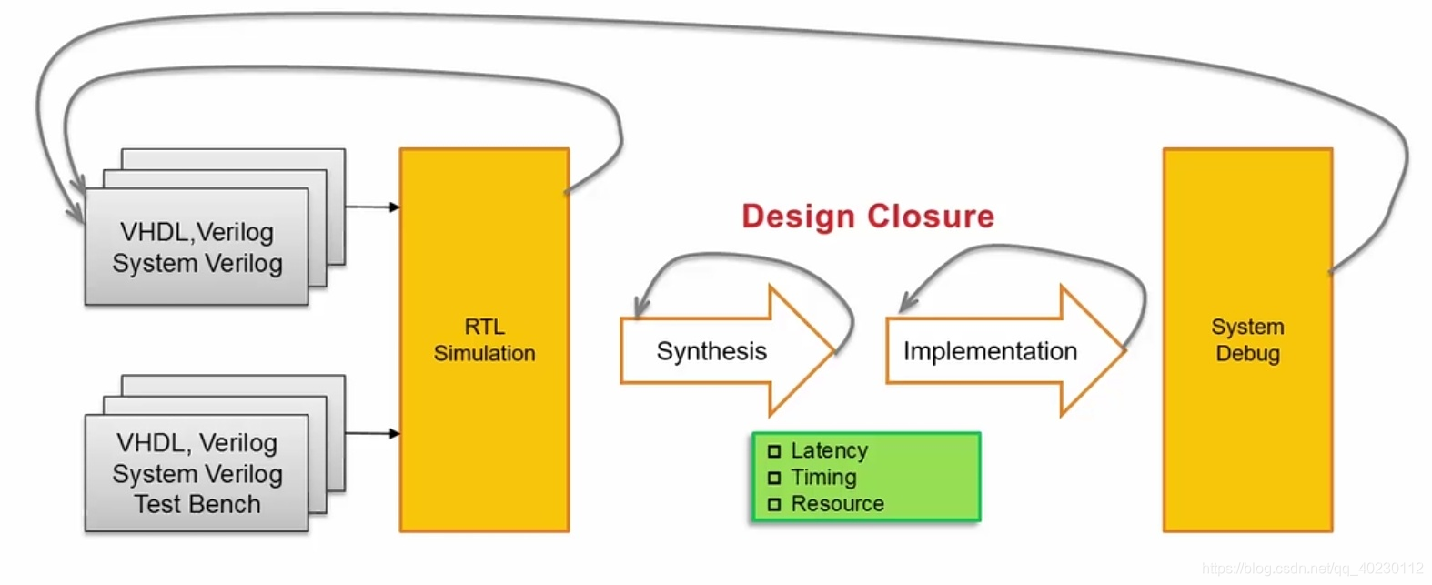传统用于FPGA设计的方法都是基于RTL描述的,RTL即基于Verilog/VHDL等硬件描述语言直接对所需要实现的硬件进行描述,然后生成相应的硬件电路,基本流程如下图所示: