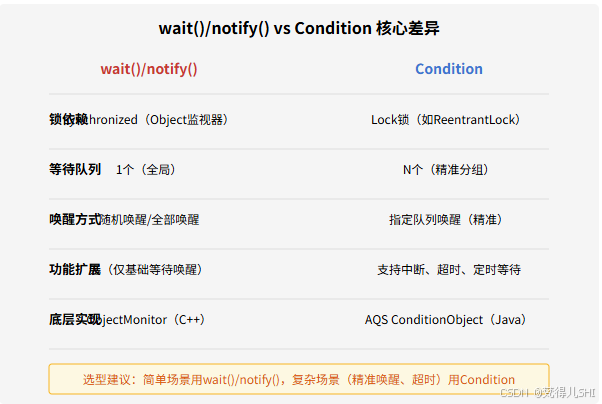 简单场景下,wait ()/notify () 足够用;当需要精准唤醒、超时等待等复杂需求时,Condition 是更优选择。