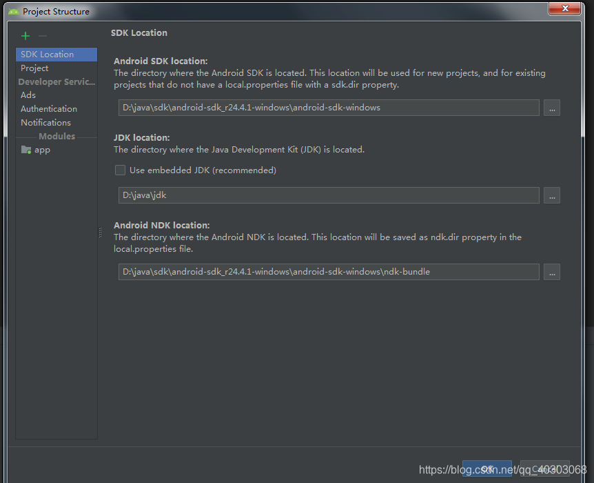 在sdk上我选择了24.4.1版本的,项目是用的4.1.1版本,AS用的3.2版本,Gradle也是和AS版本相同的3.2版本,support因为没有找到和项目同样版本的故用的4.1.0版本