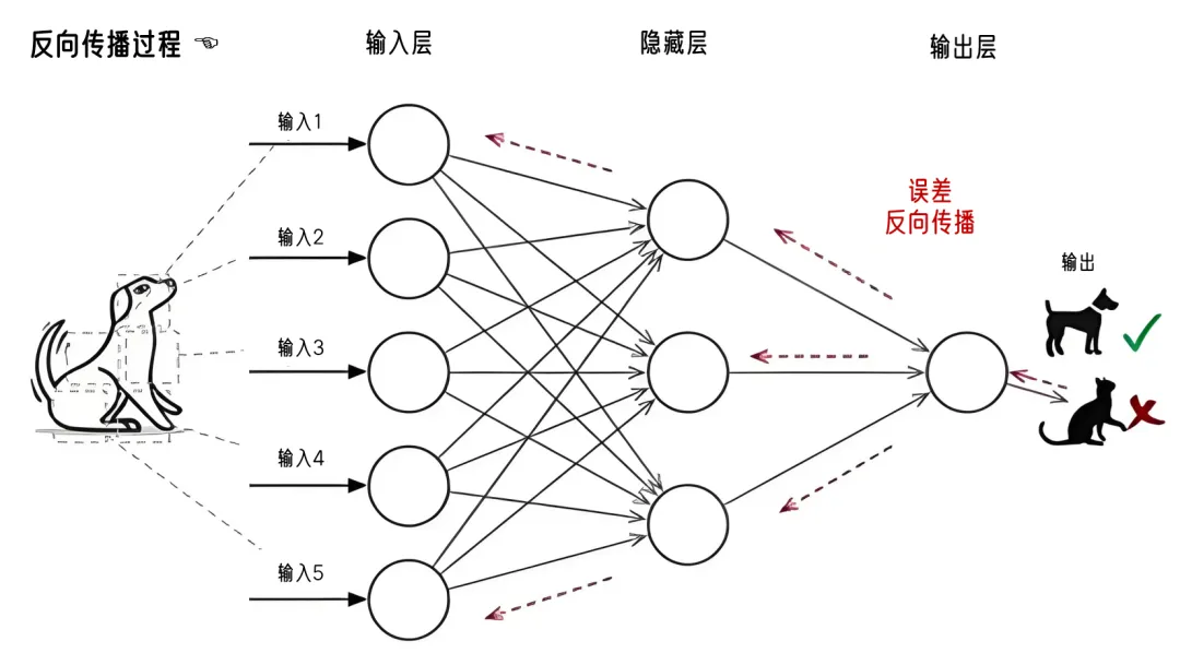 反向传播的过程是从输出层开始,沿着神经网络的层次反向传播,逐层计算梯度并更新权重。