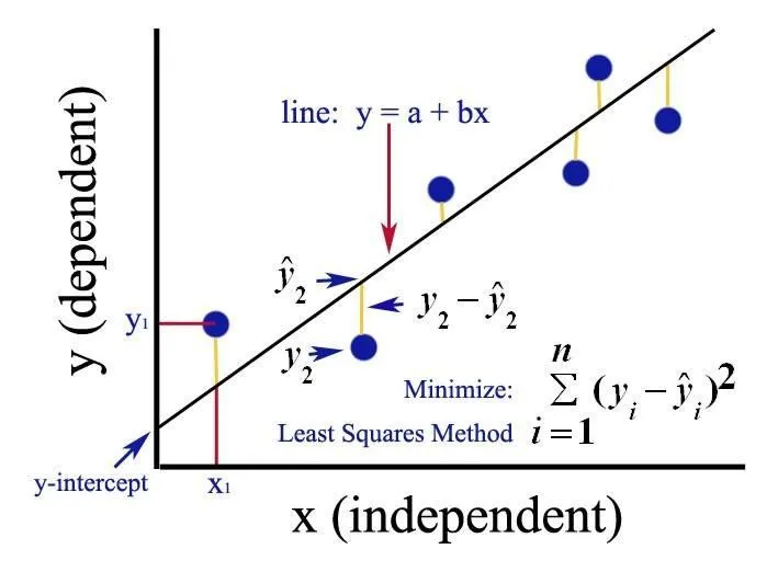 假设我们有一组数据点 (xi,yi)(x_i, y_i)(xi,yi),拟合直线的预测值为 y^i\hat{y}_iy^i,那么误差就是 yi−y^iy_i - \hat{y}_iyi−y^i。最小二乘法的目标是让所有误差的平方和最小,即:
